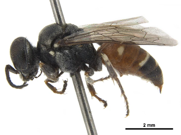 Мелкие осы (длина около 10 мм). Основная окраска чёрная с жёлтыми отметинами; некоторые метасомальные тергиты красновато-коричневые. Тергит I с латеральным килем, средние голени самки с одной апикальной шпорой. Дорсолатеральные углы пронотального воротничка округлые, омаулюс отсутствует или нечёткий. Внутренние края глаз отчётливо сходятся вверху, заднебоковой косой скутальный киль отсутствует. Относится к трибе Heliocausini Handlirsch, 1925, которые отличаются выраженным и необычным половым диморфизмом: самцы крупнее самок (самцы меньше самок у большинства насекомых), с очень большими глазами и с рядом причудливых метасомальных модификаций[2][3][4][5].