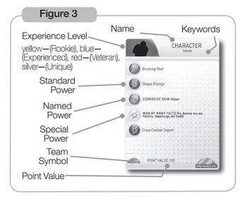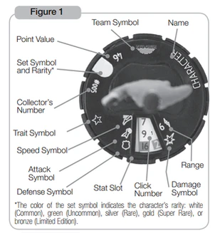 Все эти статистические данные напечатаны на циферблате, который служит основой для миниатюры. Когда фигура получает «урон», основание поворачивается на несколько «щелчков» по часовой стрелке, показывая изменённые характеристики, соответствующие урону, который она получила от атаки. Большая часть урона ослабляет персонажей, хотя некоторые на самом деле становятся сильнее при ранении, чтобы представлять преобразование или ярость. Фигурам присваивается общее значение очков, отражающее, насколько они сильны. Создание команды ограничено заранее определённым общим значением очков для фигур HeroClix, которое обычно кратно 100. Значение диапазона указывает, на каком расстоянии персонаж может атаковать другого персонажа и способен ли он атаковать несколько персонажей одновременно, обычно определяется на основе способностей каждой фигуры. Первоначально персонажи появлялись в нескольких редкостях с изменённой статистикой. Эти изменённые характеристики представляли «Опыт» персонажа, варьируясь от «Новичка» (жёлтое кольцо на базе) до «Опытного» (синее кольцо) до «Ветерана» (красное кольцо), (хотя это больше не используется) чем опытнее персонаж, тем выше обычно статистика.[11]В результате значение очков также будет выше. Некоторые символы имеют несколько значений очков и несколько соответствующих начальных позиций. Символ признака соответствует карточке персонажа. Карта персонажа — это карта, специфичная для конкретного персонажа HeroClix. Если по какой-либо причине у вас нет соответствующей карточки персонажа для вашей миниатюры, она доступна через Печать и Игровую Систему на веб-сайте WizKids. Карты персонажей описывают, какие способности будут у персонажа на его циферблате, но не говорят, где они будут находиться. Кроме того, он показывает особые черты и способности, которые в противном случае были бы слишком сложными для передачи на боевом циферблате. Многие из этих способностей совершенно уникальны для персонажей, которые ими обладают.