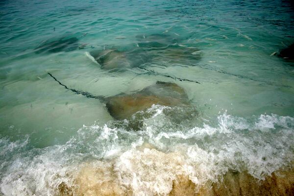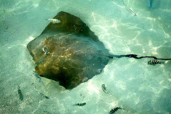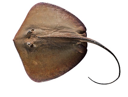 Брюшные плавники маленькие и довольно узкие. Цилиндрический, сильно утончающийся к кончику хвост немного превышает ширину диска. Кожные складки на хвостовом стебле отсутствуют. На дорсальной поверхности в центральной части хвостового стебля расположен тонкий шип, соединённый протоками с ядовитой железой. Иногда у скатов бывает до 3 шипов. Периодически шип обламывается и на их месте вырастает новый. Дорсальная поверхность диска имеет зернистую фактуру и плотно покрыта крошечными сердцевидными чешуйками, которые располагаются широкой полосой от области между глаз до хвоста. В центральной части диска расположены один или два ряда крупных копьевидных колючек. За исключением пятнистых морф окраска дорсальной поверхности диска ровного жёлто-коричневого цвета. Хвост позади шипа серого цвета. Вентральная поверхность диска белая. Максимальная зарегистрированная ширина диска 150 см, а общая длина 3 м[4].