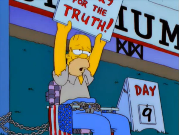 Восторженная публика поздравляет Гомера с успешным окончанием голодовки и откармливает его своими хот-догами и Гомер быстро приходит в себя. Гомеру удалось невозможное — он не только доказал всем, что он не только не врал, но и победил большую корпорацию, что мало кому удаётся.