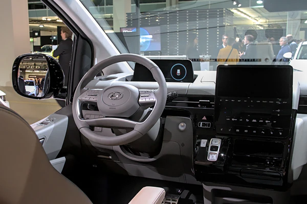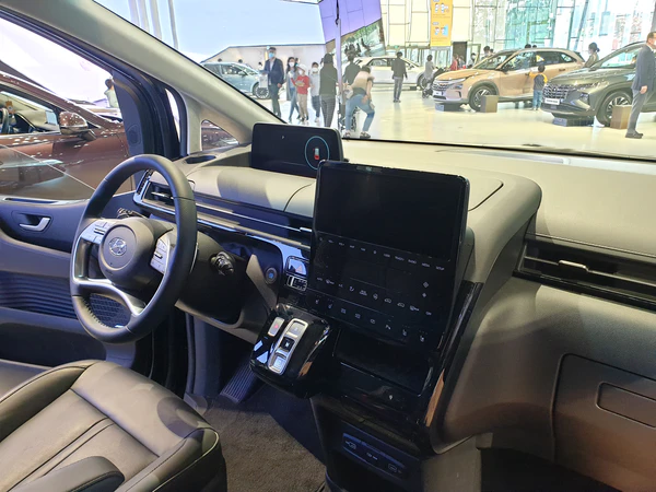 Стандартные модификации Hyundai Staria — Tourer и Cargo. Впереди установлены горизонтальные передние фары и радиаторная решётка, окрашиваемая в цвет кузова. Для более наглядной видимости окна автомобиля сделаны шире, чем на Hyundai H-1. На приборной панели присутствует сенсорный экран[10].