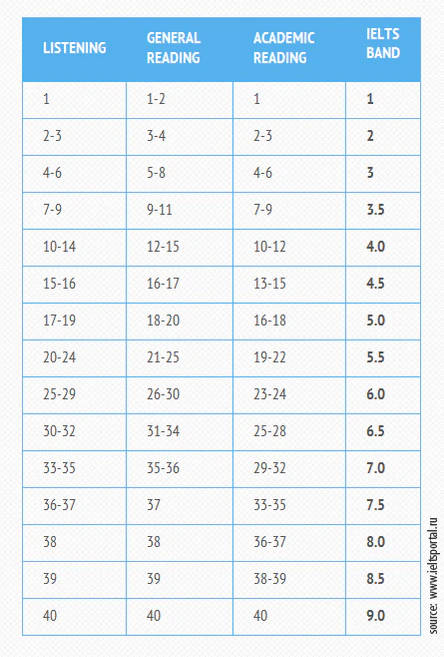 В IELTS используется система оценки с 0.0 до 9.0, с шагом 0.5.
