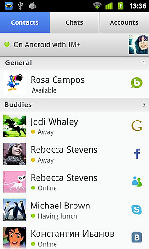 IM+ — кроссплатформенная программа обмена мгновенными сообщениями для мобильных устройств, а также кроссплатформенное веб-приложение. Поддерживает протоколы Twitter, Facebook, Google Talk, XMPP, Yahoo!, AOL Instant Messenger, ICQ, Myspace, Windows Live Messenger/MSN, ВКонтакте, Mail.Ru Агент, Я.Онлайн, Одноклассники.ru.