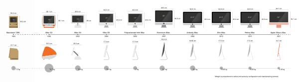 | Поколение | iMac G3 | iMac G4 | iMac G5 | Polycarbonate Intel iMac | Aluminum iMac | Unibody iMac | Slim Unibody iMac | Retina iMac | iMac (Apple silicon) |