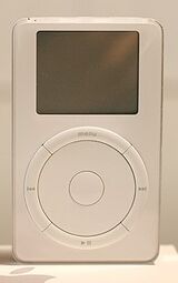 Apple представила iPod первого поколения 23 октября 2001 г. со слоганом «1,000 songs in your pocket» (Тысяча песен в Вашем кармане). У первого iPod был чёрно-белый жидкокристаллический экран и 5-гигабайтный жёсткий диск вместительностью в 1000 песен в формате MP3. Среди инноваций iPod был малый размер, достигнутый использованием 1,8″-жёсткого диска (в то время как его соперники использовали 2,5″-жёсткие диски), и лёгкая в использовании навигация с помощью механического колеса прокрутки (в отличие от поздних iPod, у которых было сенсорное колесо прокрутки), центральная кнопка «Выбрать» и четыре кнопки для управления воспроизведением вокруг колеса. Заявленное время действия батареи iPod — 10 часов, совместимость - только с компьютерами Mac. iPod поставлялся в большой картонной коробке с FireWire-кабелем, необычными для того времени белыми наушниками и зарядным устройством FireWire, позволявшим заряжать iPod от сети электрического тока, а не только от компьютера Mac. В инструкции было отдельное примечание, предупреждающее о последствиях подсоединения компьютера Mac к сети с помощью FireWire-кабеля и зарядного устройства от iPod.