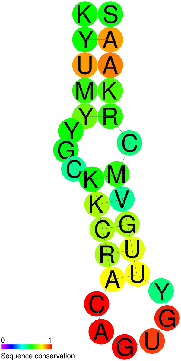 У ферритиновой мРНК IRE представляет собой последовательность длиной 28 нуклеотидов в 5′-UTR, имеющую тенденцию к образованию «дефектной» шпильки, то есть шпильки с выпетливаниями. Кроме того, последовательности, соседствующие с IRE с обеих сторон, взаимно комплементарны и формируют стеблевую структуру (англ. flanking region, FL), так что IRE оказывается частью длинной составной шпильки, которая может укладываться в третичную структуру. Эта шпилька находится вблизи кэпа (на расстоянии около 10 нуклеотидов), и в стабилизированном виде она препятствует посадке на мРНК малой рибосомной субъединицы и, таким образом, блокирует инициацию трансляции[8].