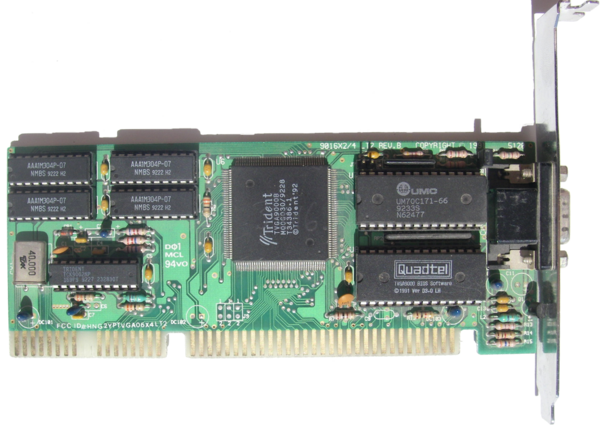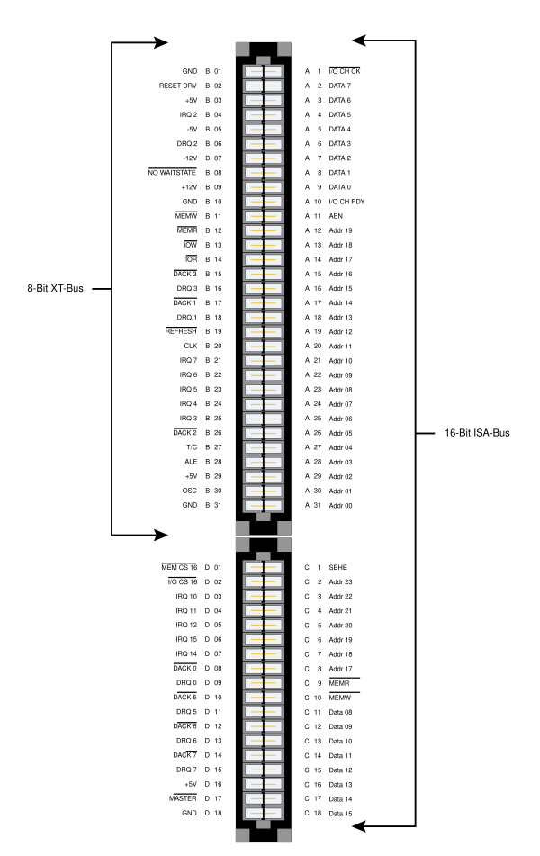Впервые шина ISA появилась в 1981 году на компьютерах IBM PC с использованием видеокарт MDA и CGA[1]. Это была 8-разрядная шина с частотой до 8 МГц и скоростью передачи данных до 4 Мбайт/с (передача каждого байта требовала минимум двух тактов шины). Разъём состоял из 62 контактов, из которых 8 использовалось для данных, 20 — для адреса, остальные — для управляющих сигналов, а также подачи напряжений питания (GND, +5 В, −5 В, +12 В и −12 В).