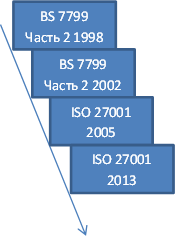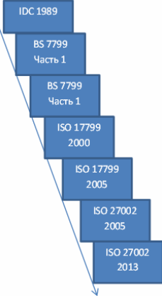 Первым стандартом по информационной безопасности, является принятый на государственном уровне в 1995 году и разработанный Британским институтом стандартов BS 7799 — Part 1. В 1999 году эта версия стандарта была переработана и передана в Международную Организацию по Сертификации, а в 2000 году утверждена в качестве международного стандарта ISO/IEC 17799:2000 (BS 7799-1:2000). Последней версией данного стандарта, принятой в 2005 году, является ISO/IEC 17799:2005. В сентябре 2002 года в силу вступила вторая часть стандарта BS 7799 Part 2 Information Security management — specification for information security management systems (Спецификация системы управления информационной безопасностью). Вторая часть BS 7799 пересматривалась в 2002 г., а в конце 2005 г. была принята ISO в качестве международного стандарта ISO/IEC 27001:2005 «Информационные технологии — Методы обеспечения безопасности — Системы управления информационной безопасностью — Требования».[1]