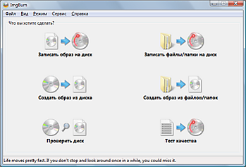 Программа позволяет записывать и считывать образы дисков, а также отдельно создавать образы, не записывая их, или же работать в режиме записи файлов и папок. Также есть режим проверки диска.