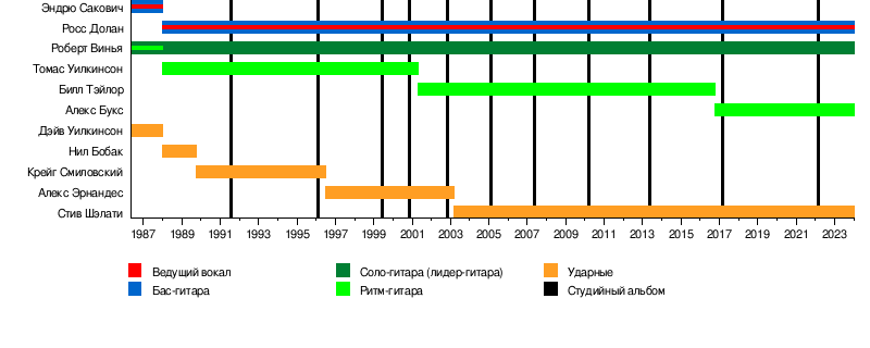 - Росс Долан (англ. Ross Dolan) — вокал, бас-гитара (1988-настоящее время)