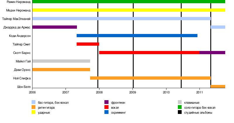 - Джарред де Армас — бас-гитара, бэк-вокал (с 2011 года), фронтмен (2006—2007)