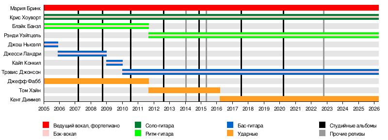 Состав группы несколько раз менялся. Джесси Лэндри был заменён Кайлом Конкиелем в 2009, а Конкиель был заменён Трэвисом Джонсоном в 2010. Джефф Бафф и Блэйк Банзел ушли из группы в 2011 и были заменены Томом Ханом и Рэнди Вейтзелом соответственно. В марте 2016 года барабанщик Том Хэйн заявил об уходе из группы, его заменой был назначен Кент Диммел, бывший участник 3 By Design.