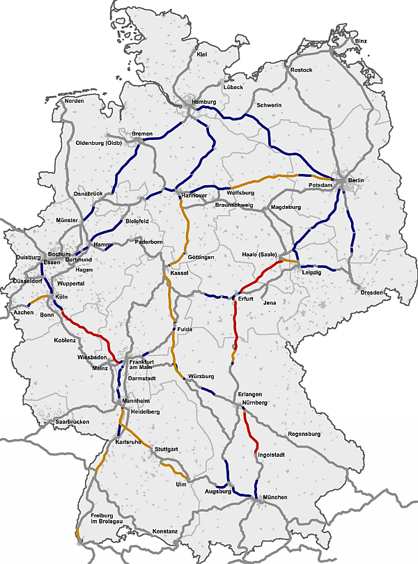- Из Берлина через Вольфсбург, Брауншвейг, Кассель, Фульду и Франкфурт-на-Майне до Маннхайма, оттуда через Карлсруэ и Фрайбург в Базель (Linie 12) или через Штутгарт, Ульм и Аугсбург в Мюнхен (Linie 11)