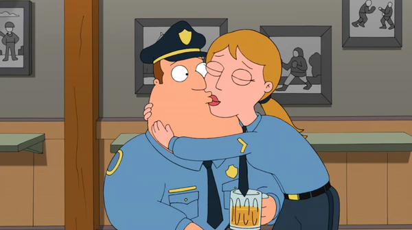Питер с Гленном сидят в баре, в это время по телевизору идут новости, в которых говорится о том, что местный полицейский Джо Суонсон смог провести операцию по изъятию огромного количества наркотиков у местных наркодилеров. Джо заходит в бар, все ему аплодируют, говоря слова похвалы и радости за него. Он объявляет о том, что в его честь сегодня будет организована вечеринка и все приглашены не неё.