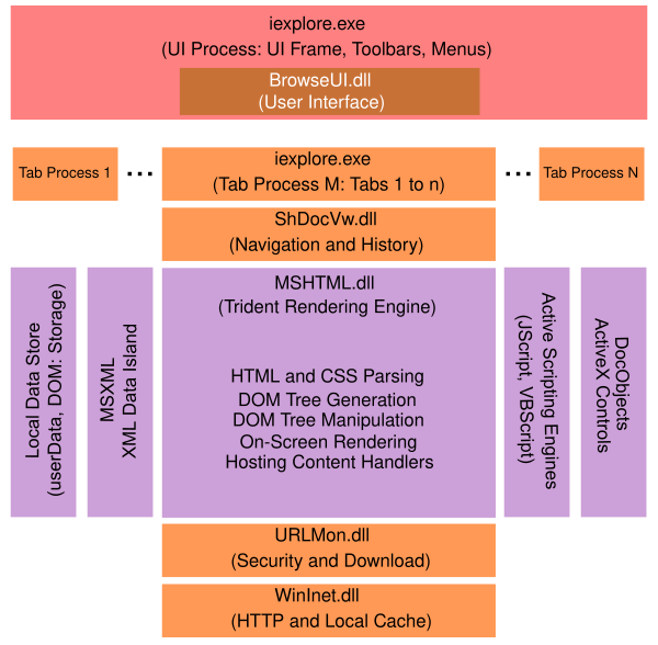 Internet Explorer использует компонентную архитектуру на технологическом стандарте Component Object Model. Она состоит из нескольких главных компонентов, каждый из которых помещён в отдельную динамически подключаемую библиотеку (DLL) и отображает набор инструментов интерфейса программирования приложений COM с хостингом в главном исполнимом модуле Internet Explorer, iexplore.exe[52]: