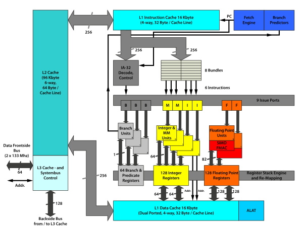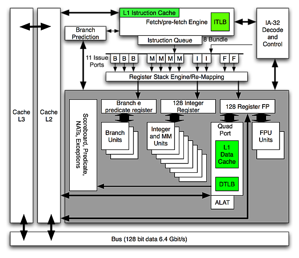 | L2-кэш | 256 кБ в Itanium2 256 кБ (данные) + 1 МБ (инструкции) или 512 кБ (инструкции) в серии Itanium2 9x00 |