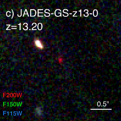 JADES-GS-z13-0 — галактика лаймановского разрыва, обнаруженная космическим телескопом «Джеймс Уэбб» в сентябре 2022 года. Является самой удалённой от Земли и одной из самых ранних из известных науке галактик, образовавшись спустя 320 млн лет после Большого взрыва[3]. Её спектроскопически подтверждённое красное смещение (z) составляет 13,2. Это соответствует 13,6 млрд световых лет[4][2], однако из-за расширения Вселенной собственное расстояние до галактики составляет около 33,6 млрд световых лет[5].