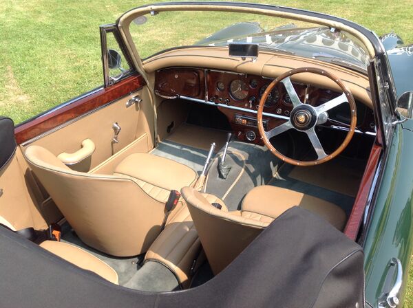 Отделанная ореховым деревом панель приборов на XK140 была сменена на кожаную. На первых автомобилях в кузове купе, до июня 1958 года, устанавливалась алюминиевая центральная панель приборов. Тонкие двери автомобиля давали больше внутреннего пространства. На передних габаритных огнях, располагавшихся на крыльях, имелся небольшой красный индикатор, говорящий водителю о включенном свете[2].