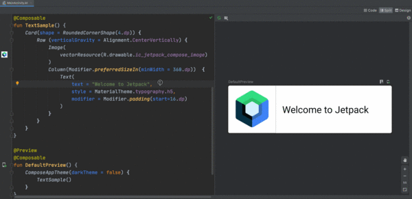 В Jetpack Compose пользовательский интерфейс определяется с помощью функций с аннотацией @Composable, которые называются компонуемыми функциями и описывают состояние экрана. Jetpack Compose использует плагин компилятора Kotlin для преобразования компонуемых функций в UI-элементы[1]. Например, функция-компонент Text отображает на экране текстовую метку.