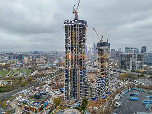 Строительство комплекса разделено на несколько этапов. На первом этапе, стартовавшем в декабре 2023 года, когда было выдано разрешение на строительство, возводятся две башни в 57 и 48 этажей, которые будут соединены между собой каскадными террасами.[4] Согласно данным ЕИСЖС, заселение небоскрёбов первой очереди запланировано на сентябрь 2028 года.