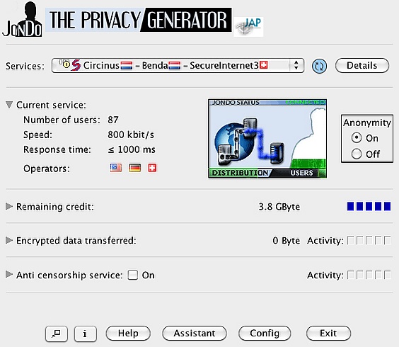 Как следствие, клиент JAP был переименован в JonDo, а сама служба — c AN.ON на JonDonym[11]. Цепочки прокси JonDonym в основном обслуживаются малыми и средними предприятиями во многих странах. В бесплатной версии применяется цепочка из двух прокси-серверов, как правило, из разных стран (указываются в программе в виде флага), при покупке лицензии их число увеличивается до трех точек[8], а при использовании протокола https — четырех, для повышенной безопасности[5]. Поскольку подрядчики Jondos GmbH должны обеспечить достаточную пропускную способность своих прокси-серверов, возможен анонимный просмотр веб-страниц на скорости всего 50 Кбит/с[7]. Бесплатные цепочки прокси все еще работают, но, в отличие от коммерческих, они не могут предложить низкую задержку, несколько серверов в цепочке или гарантированную пропускную способность.