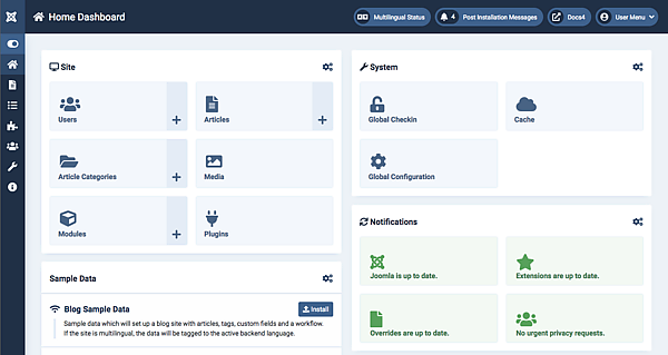 CMS Joomla! включает в себя минимальный набор инструментов при начальной установке, который дополняется по мере необходимости. Это снижает загромождение административной панели ненужными элементами, а также снижает нагрузку на сервер и экономит место на хостинге.