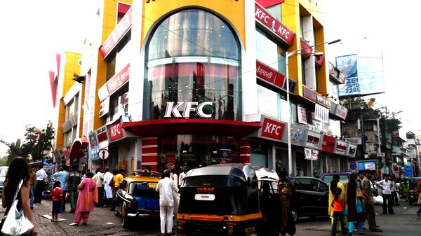 Работа KFC в Индии началась в июне 1995 года с открытия двухэтажного кафе на бангалорской фешенебельной улице Бригейд-Роуд[199]. По мнению журналиста Майкла Уайта, компания не могла выбрать «более сложного места для своего первичного появления в стране»[200][прим. 23]. В Бангалоре располагался центральный офис организации Karnataka Rajya Raitha Sangha, одного из влиятельнейших, гласных и протекционистских фермерских объединений в Индии[103]. Появление KFC спровоцировало ряд протестных акций, в которых приняли участие левые, антиглобалисты и «зелёные», а также местные фермеры, недовольные тем, что компания отказывалась от сотрудничества с местными поставщиками[201]. Многие индийцы опасались укрепления потребительской культуры, утраты национальной самодостаточности и разрушения традиционных укладов[202]. Протест достиг кульминации в августе 1995 года, когда кафе на Бригейд-Роуд было несколько раз ограблено[199]. Менеджмент ресторана добился установки полицейского фургона, который должен был защищать кафе на протяжении года[201]. 13 сентября 1995 года местные власти санкционировали закрытие кафе, объявив его продукцию вредной для здоровья. Тем не менее, ресторан возобновил работу уже через шесть часов, так как Высокий суд штата Карнатака отменил решение исполнительной власти по запросу KFC. Основной тезис компании состоял в том, что приготовление блюд в Индии происходит по той же формуле, что и в 77 других государствах[203]. Сельский активист М. Д. Нанджундасвами заявил, что продукты KFC будут негативно сказываться на здоровье бедствующих, поскольку компания будет забирать у них зерно и делать из него корма для животных[204]. Бывший министр экологии Манека Ганди присоединилась к протестной кампании[204]. Ко всему прочему, компанию обвинили в превышении нормативного уровня глутамата натрия и обжаривании блюд в свином жире[205]. Работа второго кафе, появившегося теперь в Дели, была приостановлена властями в ноябре. Предполагается, что данное действие было продиктовано соображениями охраны здоровья, однако более вероятным представляется стремление власти избежать бангалорского сценария[206]. Через некоторое время кафе в Дели было закрыто навсегда[207].