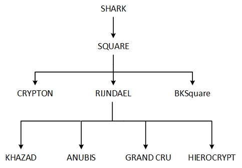 KHAZAD, как и алгоритм AES (Rijndael), принадлежит к семейству блочных шифров, произошедших от шифра SHARK.[3][4]