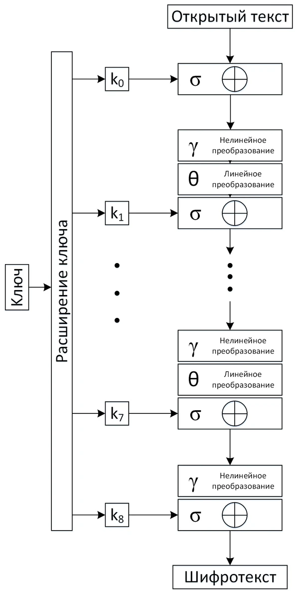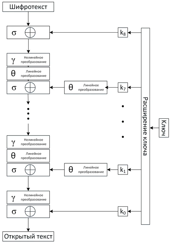 | Расписание (расширение) ключа | Аффинное преобразование, полученное в результате работы шифра в режиме обратной связи по шифрованному тексту | Схема Фейстеля, где функцией Фейстеля является раундовая функция шифра |