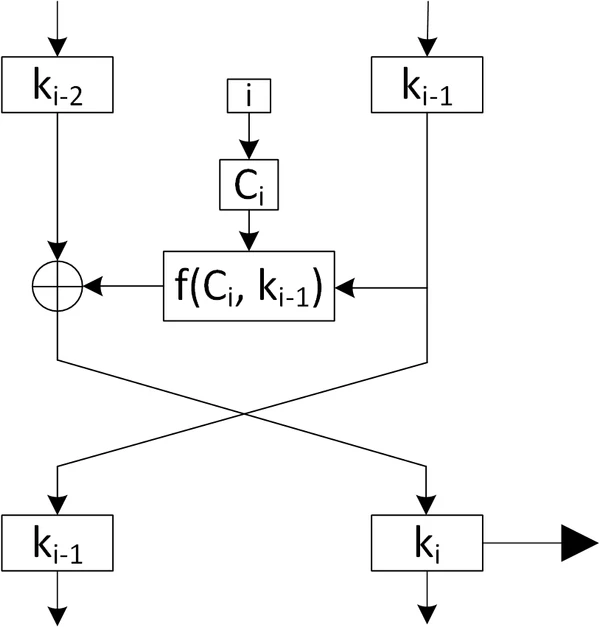 Ключи вычисляются по схеме Фейстеля: