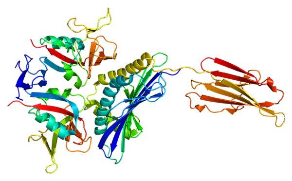 У человека рецепторный комплекс NKG2D представляет собой гексамерную структуру. NKG2D сам по себе образует гомодимер, эктодомены которого служат для связывания лиганда[8]. Каждый мономер NKG2D связан с адаптерным сигнальным димерным белком DAP10 за счёт электростатических взаимодействий между положительно-заряженным остатком аргинина на рецепторе и отрицательно-заряженными остатками аспарагиновой кислоты трансмембранного фрагмента адаптерного белка[9]. После связывания лиганда адаптерный белок DAP10 переносит сигнал за счёт рекрутирования субъединицы p85 PI3K и комплекса Grb2-Vav1, которые заппускают дальнейший перенос сигнала[10].