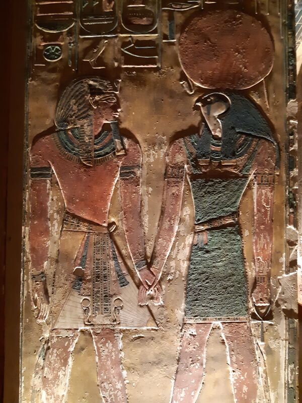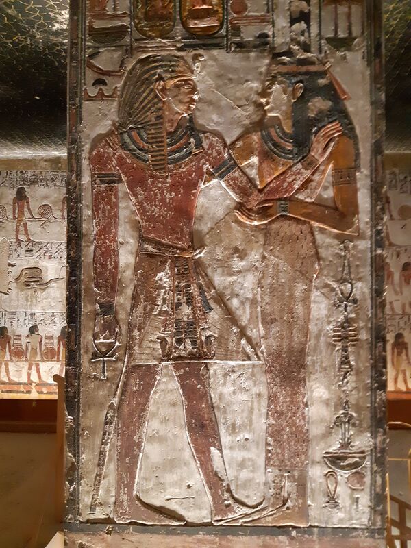 Коридор заканчивается вратами; на пилястрах этих врат изображён на золотом троне фараон в пышной военной одежде и вооружении. От ворот на 6 ступеней вниз — маленькая аванзала, в которой правитель изображён стоящим перед богами Хатхор, Гором, Анубисом, Исидой, Осирисом и Птахом.