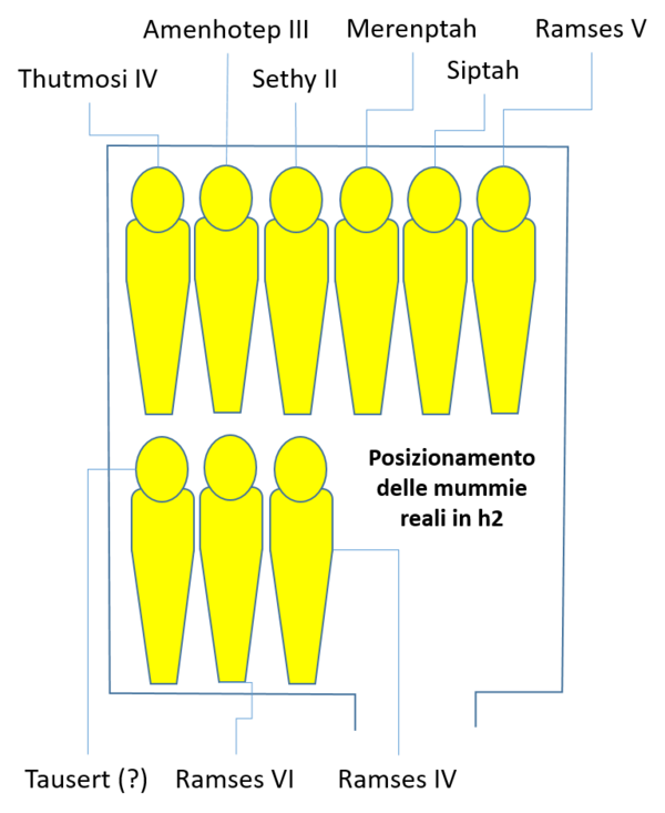 Идентифицированные по надписям на пелёнах[3][2] и генетико-генеалогическим экспертизам мумии располагались в одном из подсобных помещений (h2) в следующей последовательности: