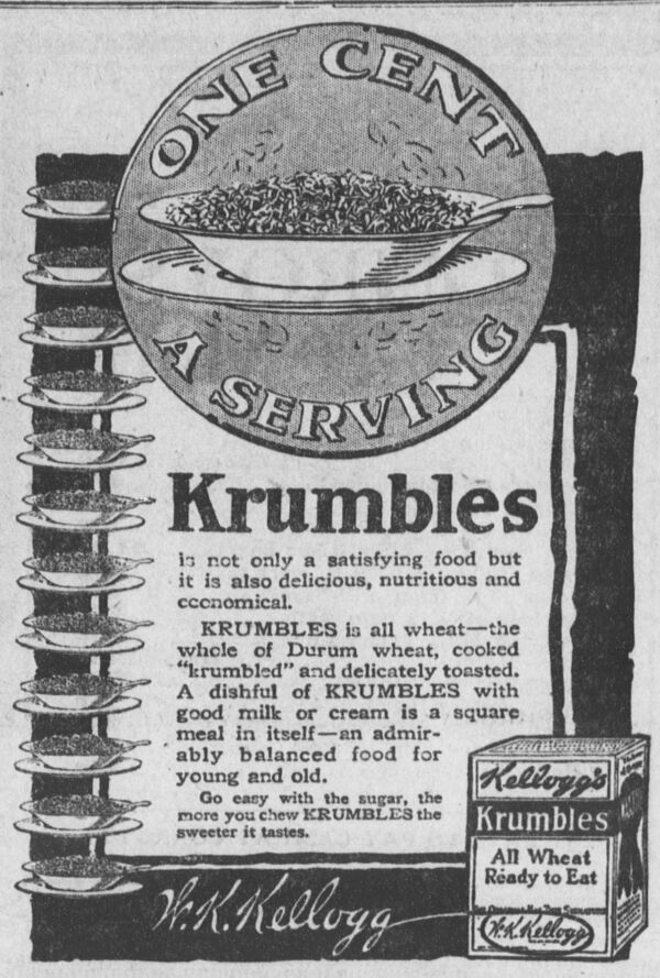 Компания выпускала, разработанные братом основателя Джоном, «кукурузные хлопья Келлога» (англ. Kellogg’s Toasted Corn Flakes), которые после изменения рецептуры (Уильям добавил сахар в несладкие хлопья Джона) быстро стали крайне популярными.
