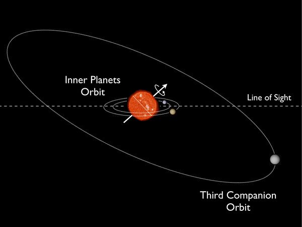 В планетарной системе Kepler-56 в 2012 году были открыты транзитным методом две планеты Kepler-56 b и Kepler-56 c, которые движутся по сильно наклонённым (83,84° и 84,02°) к экваториальной плоскости звезды орбитам (как и экзопланета WASP-17 b)[5]. Расстояние до материнской звезды — 0,1028 а. е. и 0,1652 а. е. соответственно. Радиусы газовых гигантов — 0,58 и 0,88 радиуса Юпитера, а масса — 0,07 и 0,569 массы Юпитера соответственно[6]. Необычные орбиты внутренних планет учёные объясняют наличием гипотетической внешней планеты Kepler-56 d, вращающейся по вытянутой орбите.
