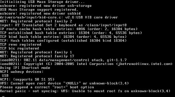 Одной из самых распространённых причин kernel panic является невозможность найти и смонтировать корневую файловую систему. Часто это ошибка конфигурации, которая может быть исправлена при перезагрузке ядра вручную[6].