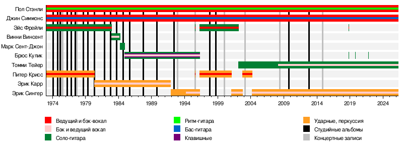 - Пол Стэнли — ведущий и бэк-вокал, ритм-гитара, иногда бас-гитара (1973—наши дни)