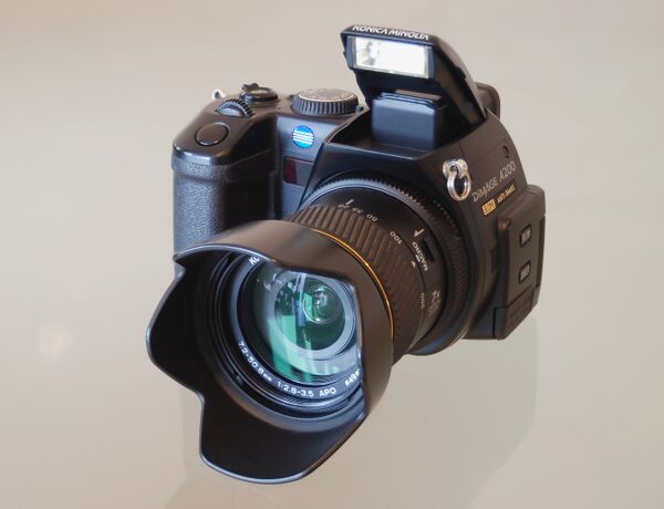 Только после слияния с Konica в конце 2004 года была выпущена Dynax/Maxxum/α 7D — цифровая SLR на базе успешной Dynax/Maxxum 7. Уникальной особенностью стала система стабилизации изображения в корпусе. Однако к тому времени Canon и Nikon уже имели широкий ассортимент цифровых SLR, и многие фотографы перешли к ним, что привело к уходу Konica Minolta с рынка и передаче активов Sony. Единственными цифровыми SLR Konica Minolta, поступившими в продажу до ухода компании, были Dynax/Maxxum 7D и Dynax/Maxxum 5D (бюджетная модель с тем же сенсором и стабилизацией).