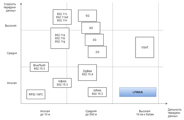 - Отсутствие единого стандарта, который определяет физический слой и управление доступом к среде для беспроводных LPWAN-сетей.