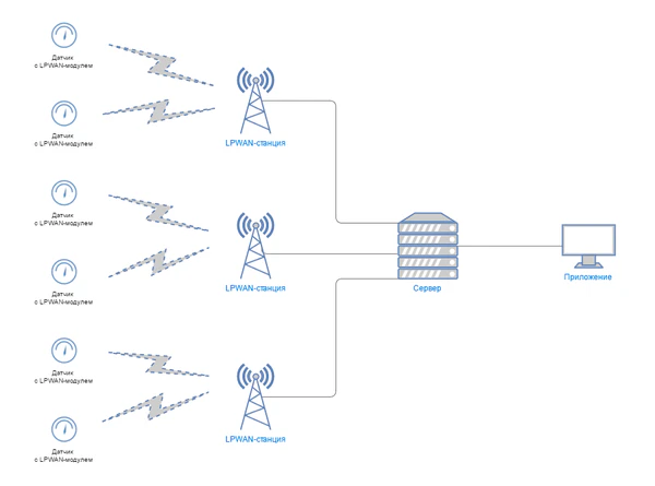 Устройство или модем с LPWAN-модулем передает данные по радиоканалу на базовую станцию. Станция принимает сигналы от всех устройств в радиусе своего действия, оцифровывает и передаёт на удалённый сервер, используя доступный канал связи: Ethernet, сотовая связь, VSAT.