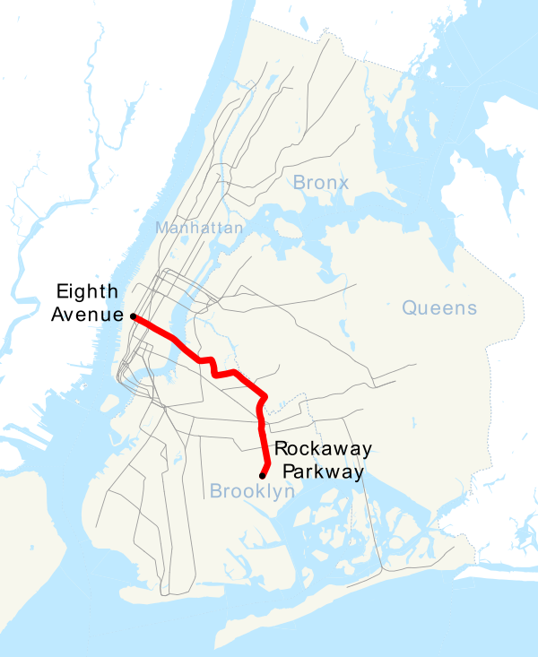 Маршрут L работает круглосуточно. Поезда следуют от станции Eighth Avenue в Манхэттене до станции Canarsie — Rockaway Parkway в Бруклине.