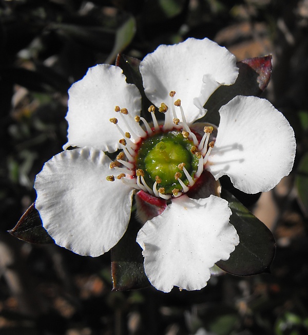 Кустарник до 3 м высотой, с узкими листьями длиной до 3 м. Цветки с 5 округлыми, белыми лепестками и красно-коричневыми чашелистиками, проглядывающими между лепестками[2]. Основной период цветения — с октября по декабрь в естественных местах произрастания вида[3].