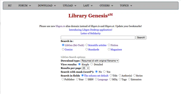 Library Genesis (или LibGen) — веб-сайт, поисковая система и онлайн-хранилище, предоставляющее бесплатный доступ к пиратским коллекциям и защищённым авторским правом произведениям, в основном научной тематики. LibGen также называют «теневой библиотекой»[1][2]. Портал был создан в 2008 году, предположительно, группой российских учёных. До 2011 года коллекция LibGen росла в основном благодаря копированию других российских интернет-архивов и интеграции около полумиллиона англоязычных работ интернет-библиотеки Library.nu (или Gigapedia), закрытой в 2012 году. Начиная с 2013 года коллекция LibGen пополняется за счет интеграции созданных издателями электронных текстовых репозиториев. До 2013 года большая часть коллекции была представлена на русском и английском языках, позднее начали добавлять работы и на немецком, итальянском, испанском и французском[3][4].