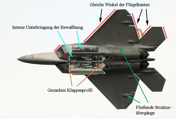 Контуры щелей, образующихся в местах соединения фонаря кабины с фюзеляжем, створки отсеков шасси и вооружения имеют пилообразную форму, что также обеспечивает эффективное рассеивание электромагнитной энергии и предотвращает её прямое отражение в направлении приемопередающей антенны РЛС противника. Крыло — ромбовидное, вертикальный стабилизатор — V-образной формы.
