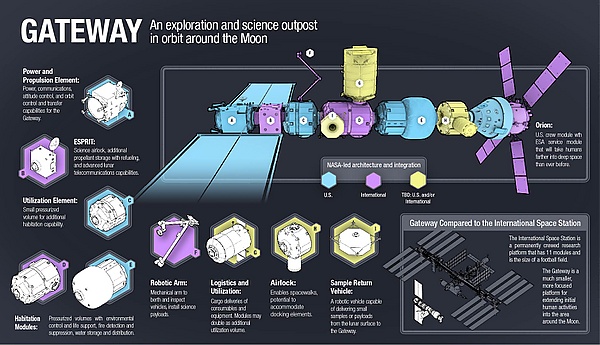 - Апрель 2019: В связи с планами правительства США переноса пилотируемой высадки на Луну с 2028 года на 2024 год и программы Артемида НАСА предложило сократить количество модулей НАСА к моменту пилотируемой высадки на Луну до двух модулей: электродвигательный модуль (Power and Propulsion Element) и небольшого жилого модуля со стыковочными узлами (U.S. Utilization Element); другие модули НАСА будут доставлены позднее[50][51].