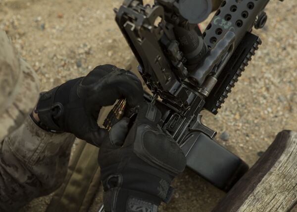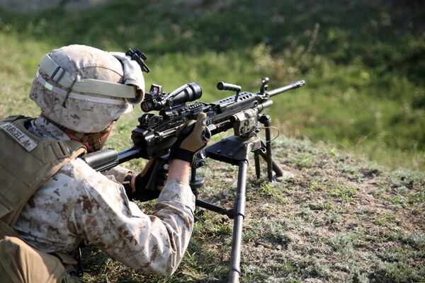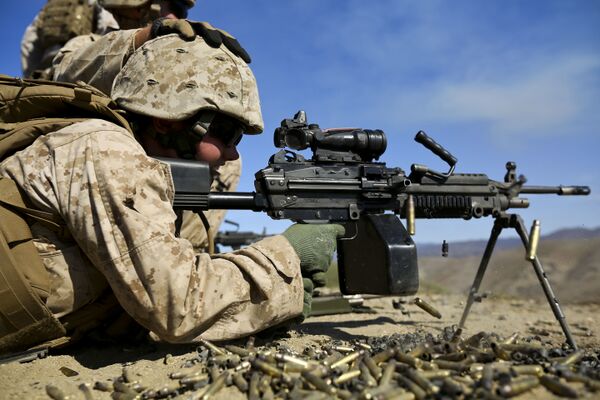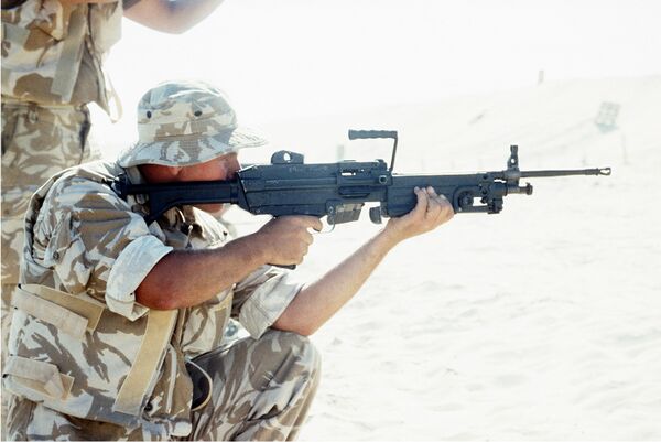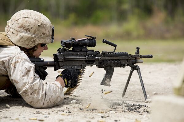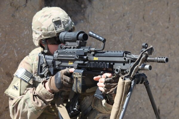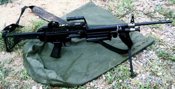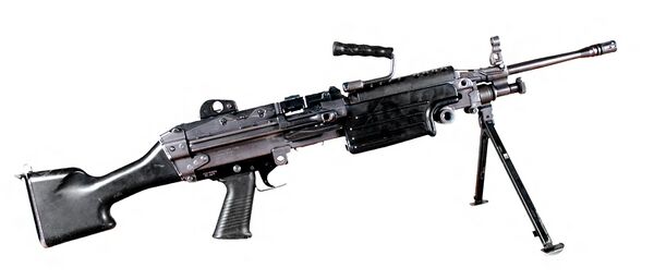 5,56-мм ручной пулемёт M249 SAW (в пер. букв. «пила», сокращение от Squad Automatic Weapon[5] — «автоматическое оружие отделения», в народе «поросёнок» — вариант ручного пулемёта FN Minimi для армии США калибра 5,56×45 мм американского производства (производится FN Manufacturing, Inc. — местным филиалом бельгийской компании FN Herstal), серийное производство началось в 1980-х годах.