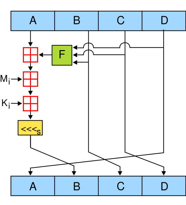 - В MD5 на каждом шаге текущий результат складывается с результатом предыдущего шага. Например, результатом первого шага является измененное слово А. Результат второго шага хранится в D и образуется добавлением А к циклически сдвинутому влево на определенное число бит результату элементарной функции. Аналогично, результат третьего шага хранится в С и образуется добавлением D к циклически сдвинутому влево результату элементарной функции. MD4 это последнее сложение не включает.