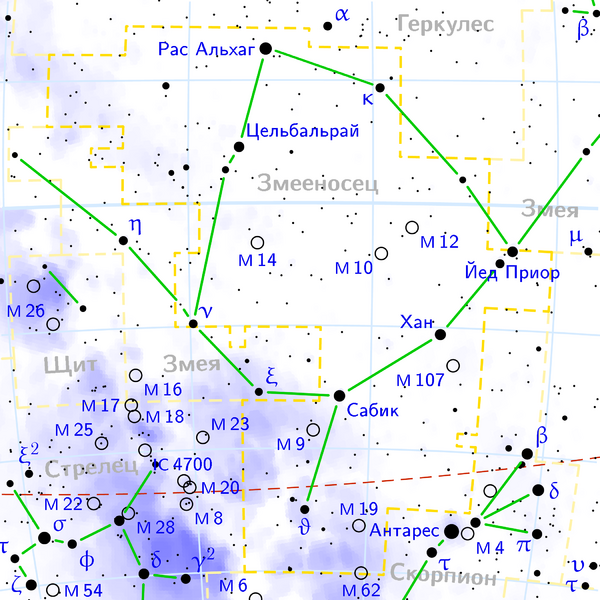 - M 10 — ближайший сосед — шаровое скопление в 7 градусах на юго-восток: