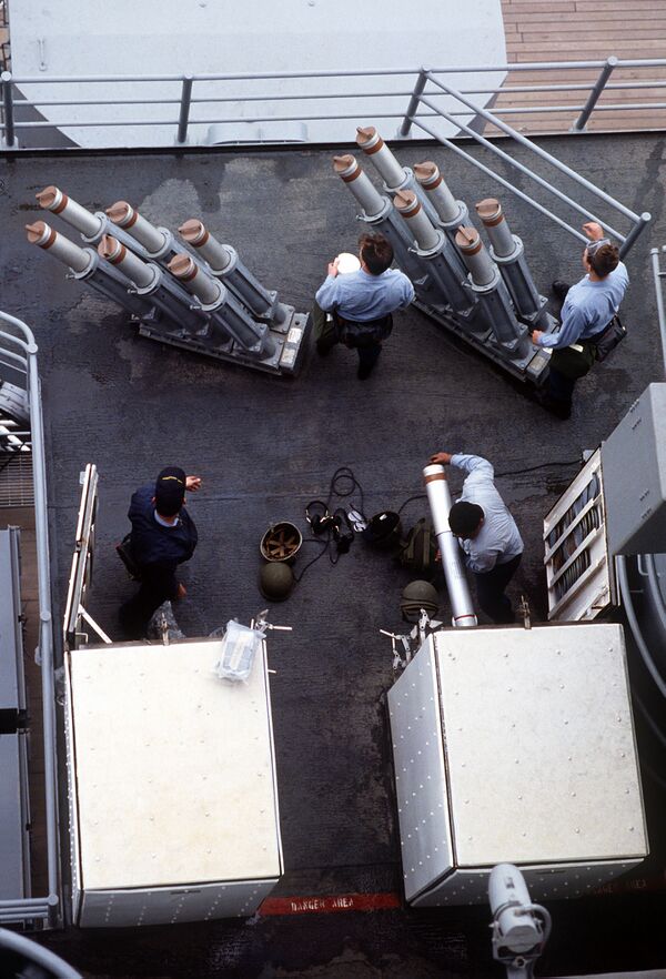 | Описание медиа | Две пусковые установки Mk 36 Mod 7 SRBOC на борту линкора BB-64 «Висконсин» |