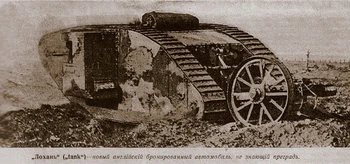 «В „Ниве“ были недавно помещены изображения изобретенного английскими военными инженерами гигантского бронированного автомобиля. Бесстрашный и неуязвимый, устремляется он всей своей громадой в самую кипень боя, под снаряды и пули, свободно берет вражьи окопы, как пустое, незначащее препятствие, и, посеяв вокруг себя разрушение и смерть, преспокойно возвращается в свой полк. Английские солдаты назвали этого своего нового боевого товарища „лоханью“ („tank“ — „тэнк“)» (Журнал «Нива». — 1917. — № 4).